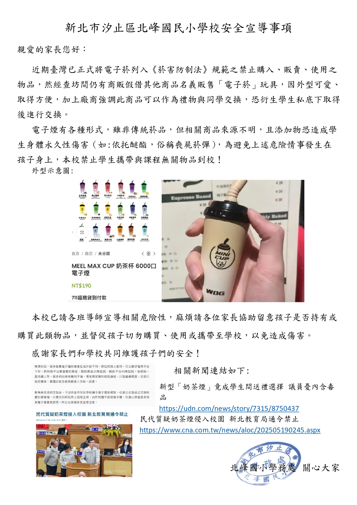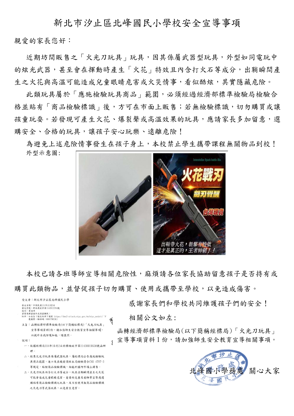 本校已請各班導師宣導相關危險性,麻煩請各位家長協助留意孩子是否持有或購買此類物品,並督促孩子切勿攜帶至學校,以免造成危險傷害。