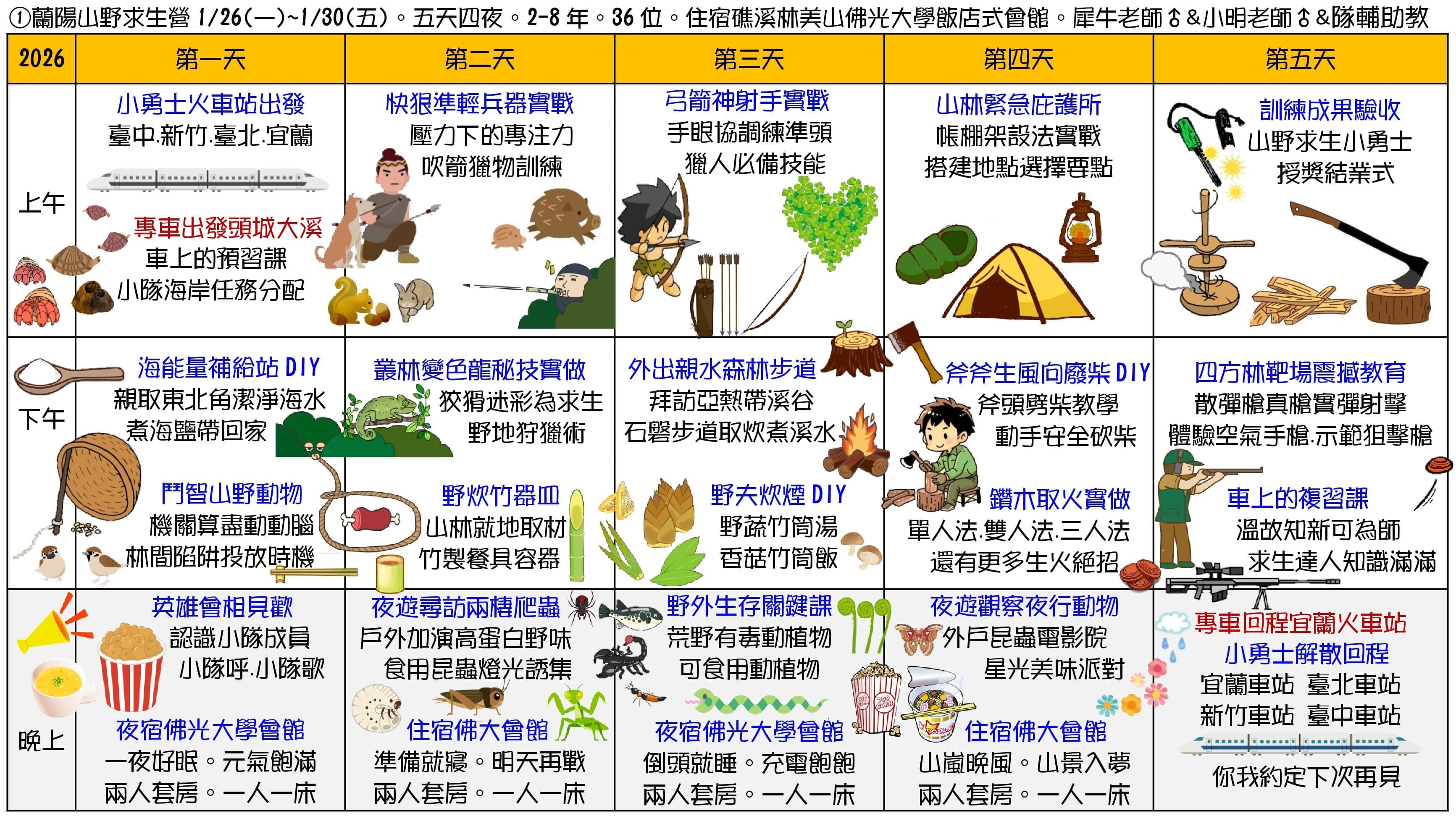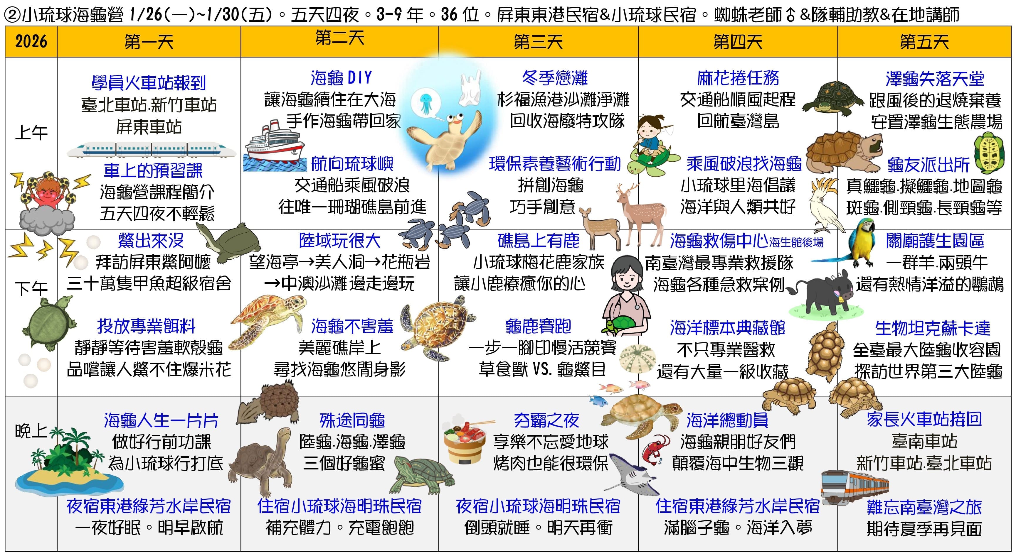 ①蘭陽山野求生營(5天4夜)、②小琉球海龜營 (5天4夜)、③宜蘭生態農場營(3天2夜)、