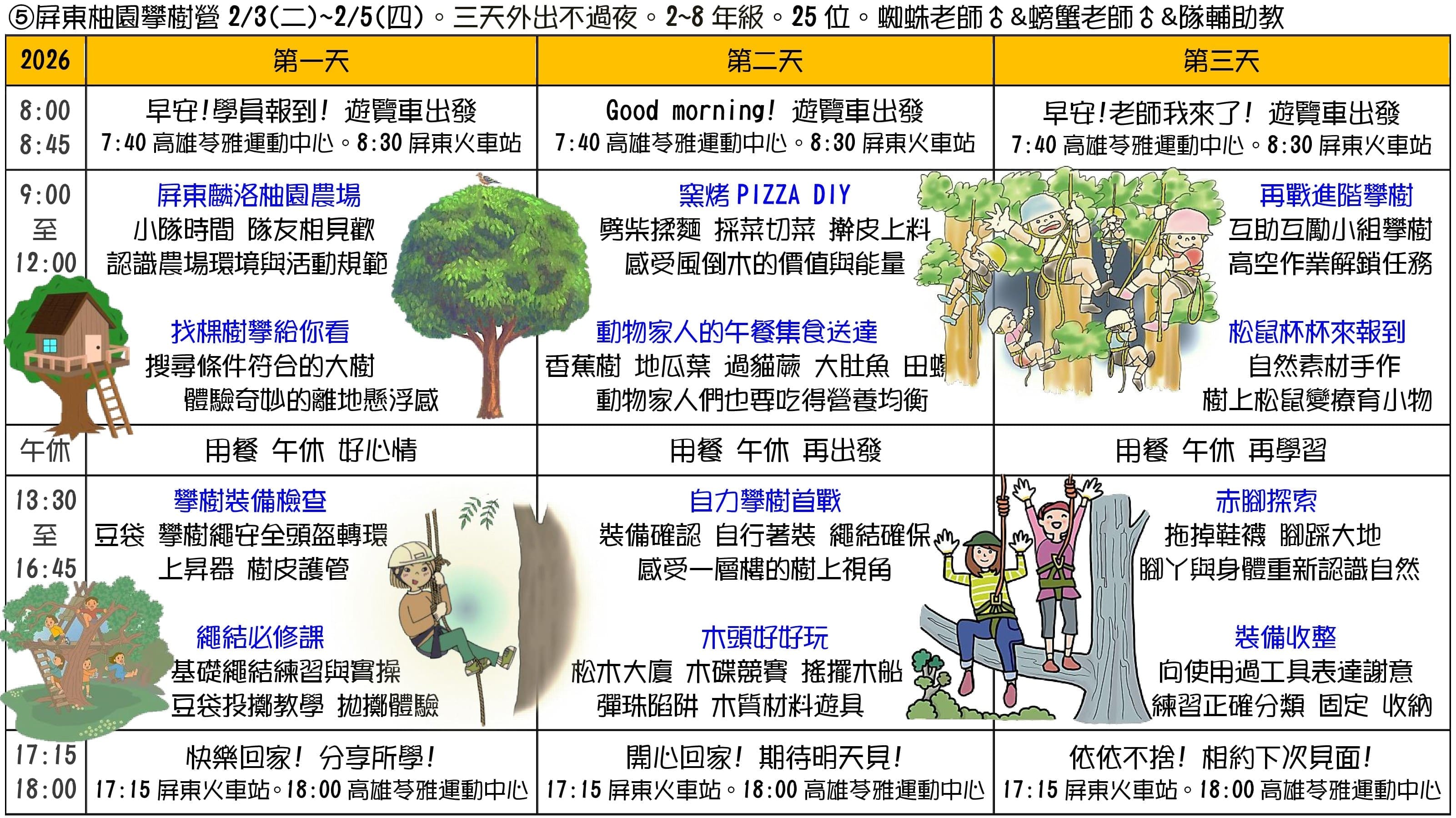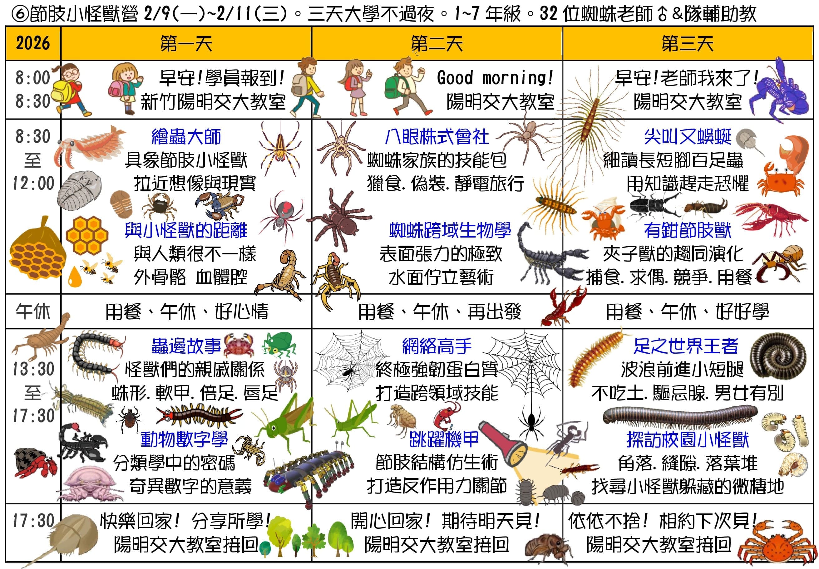 ④TPE博物館生態 營(3天外出不過夜)、⑤屏東柚園攀樹營(3天外出不過夜)、⑥節肢小怪獸營(3天大學不過夜)、