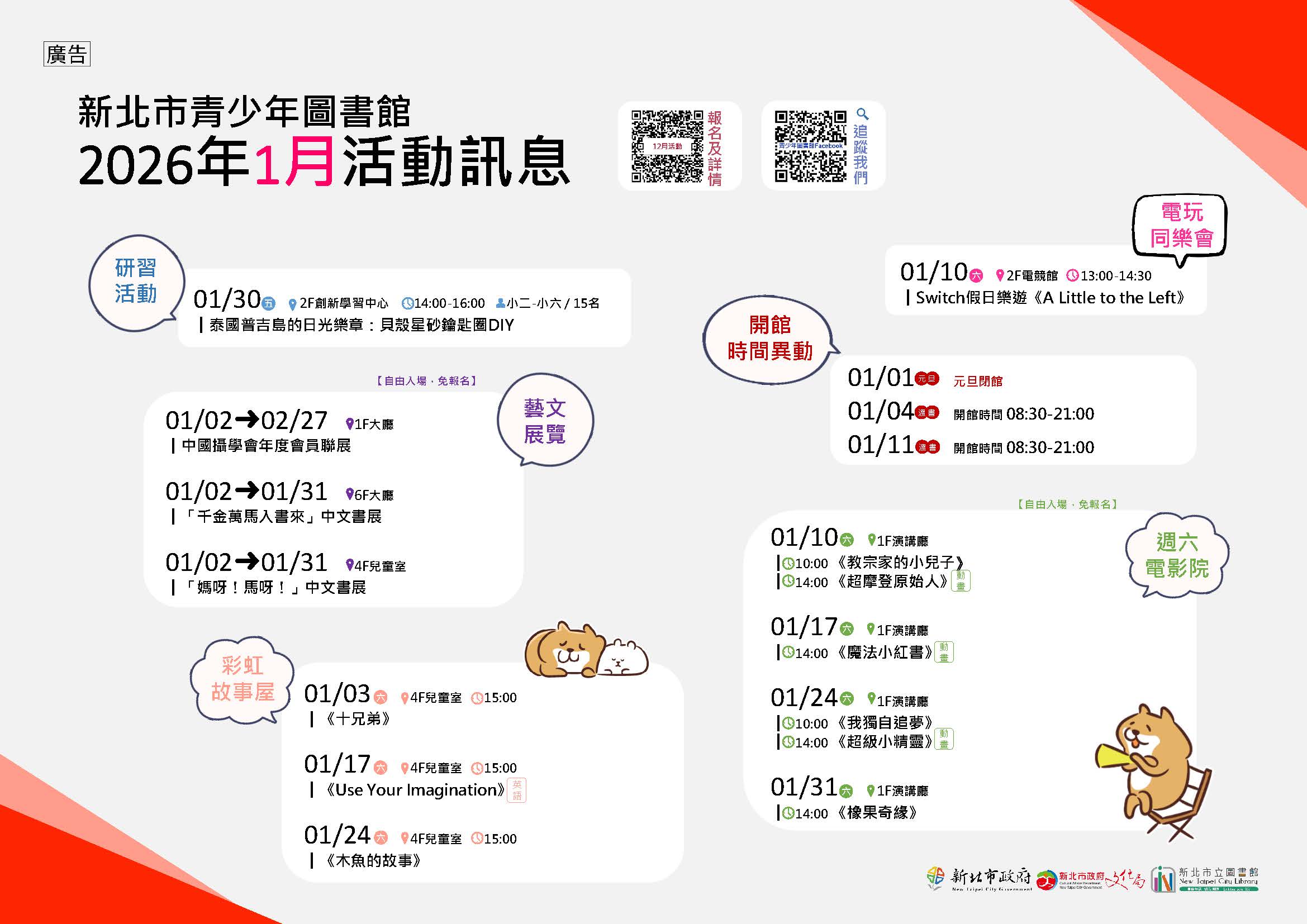 新北市青少年圖書館「115年1月份活動、展覽及陪讀」活動資訊