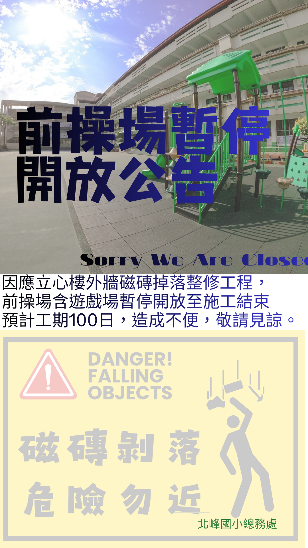 因應立心樓外牆磁磚掉落整修工程, 前操場含遊戲場暫停開放至施工結束 預計工期100日,造成不便,敬請見諒。